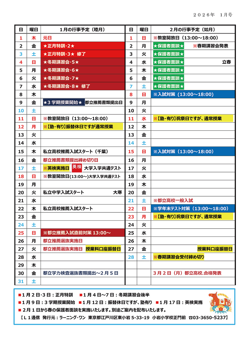 《ラーニング・ワン 1月・2月の行事予定》