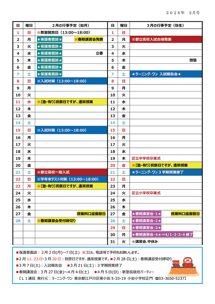 《ラーニング・ワン 2月・3月の行事予定》